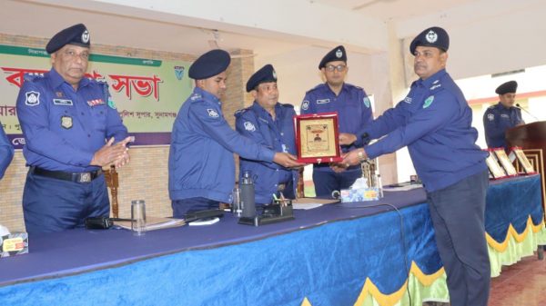 স্টাফ রির্পোটার :: সুনামগঞ্জের জগন্নাথপুর থানার অফিসার ইনচার্জ (ওসি) মোঃ রুহুল আমিন জেলার শ্রেষ্ট অফিসার ইনচার্জ হিসাবে পুরস্কারে ভূষিত হয়েছেন। আজ বুধবার (৮ জানুয়ারি) সকাল ১১ টায় জেলা পুলিশ লাইনে অনুষ্ঠিত মাসিক কল্যাণ সভায় আনুষ্ঠানিকভাবে তাঁর হাতে পুরস্কার তুলে দেন সুনামগঞ্জের পুলিশ সুপার আ ফ ম আনোয়ার হোসেন খান