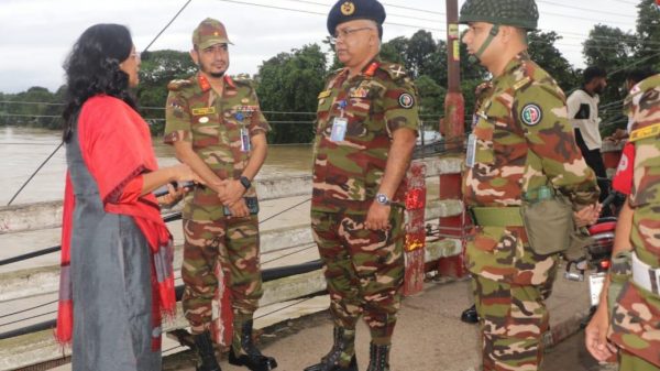 ডেস্ক রিপোর্ট :: মৌলভীবাজার জেলার সার্বিক বন্যা পরিস্থিতি পরিদর্শন করেছেন সেনাবাহিনীর মেজর জেনারেল চৌধুরী মোহাম্মদ আজিজুল হক হাজারী, ওএসপি (বার), এসজিপি, এনডিসি, পিএসসি, এমফিল। আজ বৃহস্পতিবার (২২ আগষ্ট) বিকালে শহরের মনু নদীর প্রতিরক্ষাবাঁধের ৪টি ঝুঁকিপূর্ণ স্থান, মনু ব্যারেজ, চাঁদনীঘাট ব্রিজ, পৌরসভার ওয়ার্কওয়ে, শাহ্বন্দর এলাকা ও রাজনগর উপজেলার কদমহাটা এলাকার মনু
