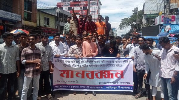 স্টাফ রিপোর্টার :: সুনামগঞ্জের তাহিরপুর থানার ওসি মাইনুদ্দিন ও এস আই হেলালের অনিয়ম-দূর্নীতি সহ যাদুকাটা নদীর পাড় কাটার সঙ্গে জড়িত থাকায় তাদের দ্রুত প্রত্যাহারের দাবীতে মানববন্ধন অনুষ্ঠিত হয়েছে। মঙ্গলবার সুনামগঞ্জ পৌর শহরের ট্রাফিক পয়েন্টে তাহিরপুরের বৈষম্য বিরোধী ছাত্র জনতার উদ্যোগে এ মানববন্ধন অনুষ্ঠিত হয়। তাহিরপুর বৈষম্য বিরোধী ছাত্র আন্দোলনের সমন্বয়ক