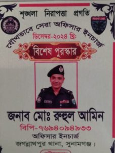 সুনামগঞ্জের জগন্নাথপুর থানার অফিসার ইনচার্জ (ওসি) মোঃ রুহুল আমিন জেলার শ্রেষ্ট অফিসার ইনচার্জ হিসাবে পুরস্কারে ভূষিত হয়েছেন।